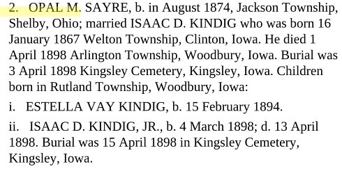 Isaac D. Kindig married Opal M. Sayre Feb 19, 1893 in Tama County, Iowa.