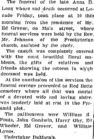 Hazelwood V. Long 1859-1923 and Mary Ellen Long 1865-1934 are also buried there.