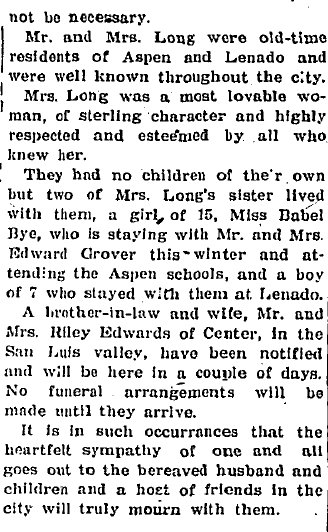 In 1910 Saguache County, William Long is 48, and niece Mabel Bye 15, born in Wisconsin and nephew Wllard Bye, also Wisconsin are with him. William is a foreman at a tin camp.
