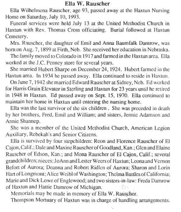 1944 Greeley, Colorado "Ed Rauscher, brother-in-law of Mrs. W. B. Daniels, and wife from Haxtun, their daughter, : Mona Rauscher, nurse in the Sterling, hospital, and his daughter-in-law, Mrs. Dale Rauscher, whose husband was with the aerial bombardiers over Germany, but who is now a prisoner of war there, were visitors in the Daniels' home the week end. Mrs. Dale Rauscher lives at Goodland, Kansas."