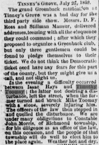 November 24, 1887 Richmond, Missouri (Ray County) Georgeville section "William Toomay arrived here from Colorado, to spend the winter with his parents.