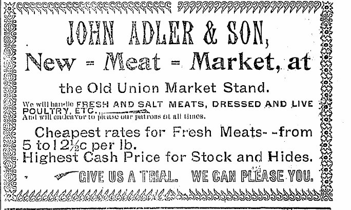 1899 "John Adler shipped a car load of hides east yesterday over the Q."