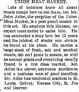 In 1885 Holdrege John Adler, 37, a butcher, born in Prussia, and Mary 36, have August 9, born in Missouri, Lena 6, Missouri, Molly 3 Missouri, and Fred 1, Nebraska.