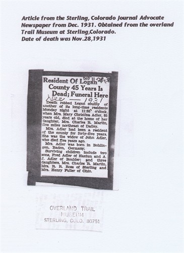 John -1848-1925 is buried in Sterling 14838615, as is Mary 1847-1931. Mary Christine Adler died December 27, 1931 at the home of her daughter six miles northeast of Haxtun. She was born February 5, 1847 in Germany to Geo Martin Adler and Anna Marina Janlein. Informant was Ida Ross of Sterling.