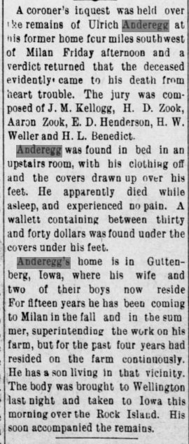heart trouble, of Ulrich Andregg (sp), brother of John Anderegg of this