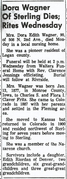 Flora Isabelle Claver CRABB died Aug 7, 1937 in Sterling 55571879