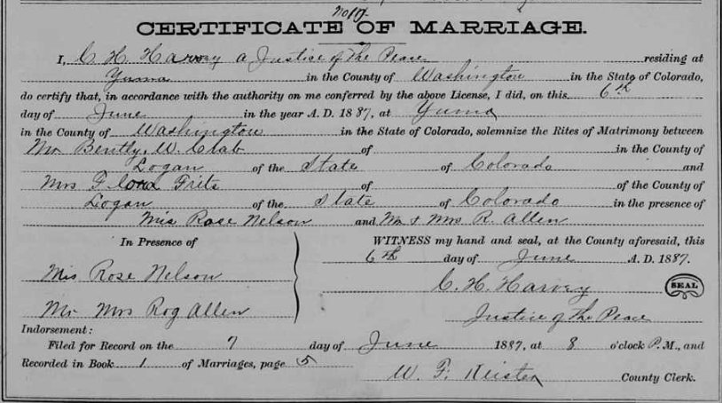 Roy Ellsworth Crabb, age 21, born in Colorado, married Ella May Tabor, age 17, on May 27, 1909 in Madrid, Perkins Count, Nebraska.