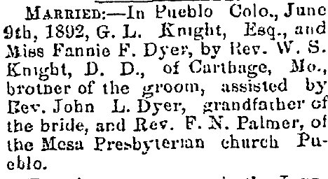 Samuel M. Dyer married Esther E. Alexander June 2, 1881 in Castle Rock.