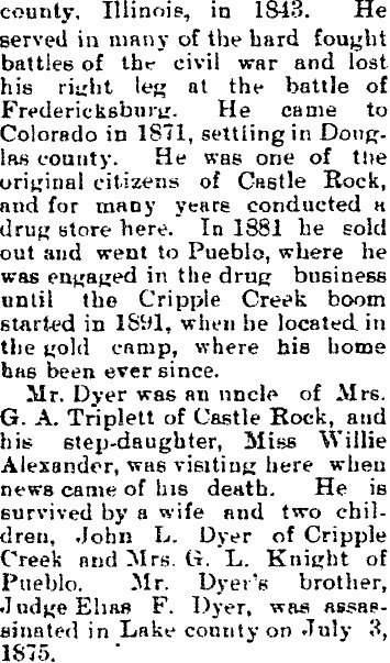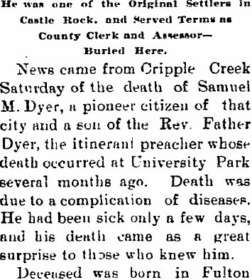 Samuel M. Dyer, born May 12, 1843, died July 12, 1902 in Castle Rock, buried