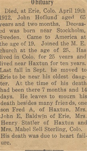 State Herald, Holyoke, CO, 5 May 1905December 15, 1908 Haxtun "Fred Hoflund worked for Mr. Orth, the drayman.