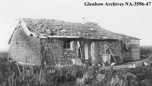 Located 9 miles south of Hanna. Poultry scratching around doorway. Wooden lean-to at right. Thomas Howatt came from United States in 1909 and built house which was used until 1927. This dwelling had a living-room and three bedrooms and was finished with wood on the inside