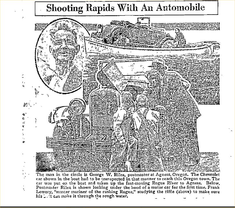 "Shooting Rapids With An Automobile The man in the circle is George W. Rilea, postmaster at Agness, Oregon. The Chevrolet car shown in the boat had to be transported in that manner to reach this Oregon town. The car was put on the boat and taken up the last-moving Rogue River to Agness. Below, Postmaster Rilea is shown looking under the hood of a motor car for the first time, Frank Lowery, "master mariner of the rushing Rogue," studying the riffle (above) to make sure the boat can make it through the rough water.