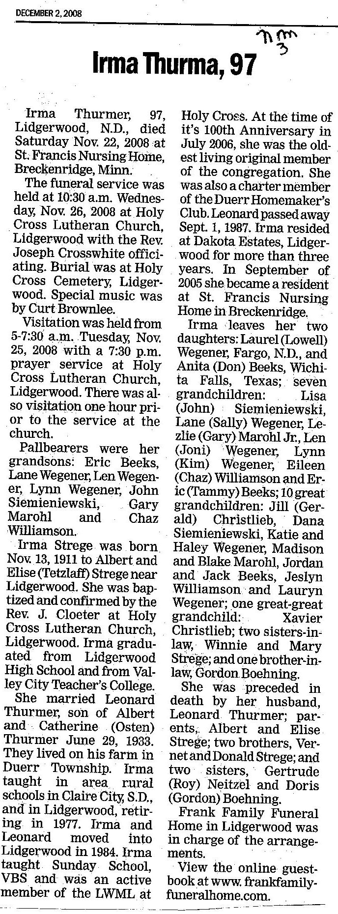 In Immanuel Lutheran Cemetery, Lidgerwood, Richland County, North Dakota is "Albert Thuermer - 1854-1912" and "Cathrina Thuermer - 1865-1911". Albert and Catherine (Osten) Thurmer had Leonard, dying Sept 1, 1987, buried at Holy Cross, Lidgerwood. They also had Anna Margaret, married Carl M. Morman, dying 1855 at age 63 in Washington, Margaret married Emil Macheel of Lidgerwood, , Mrs. Minnie Bllgren, of Marshfield, Wis, John Thurmer, born May 7, 1888 in Wien, Wisconsin, living in Delamere, N.D John died April 1967.)