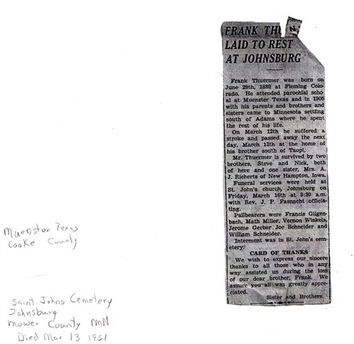 March 14, 1951 "Frank Theurmer, 61, died this morning at the farm home of his brother Steven Theurmer southeast of Adams. Funeral arrangements are to be made by the Adams funeral home."