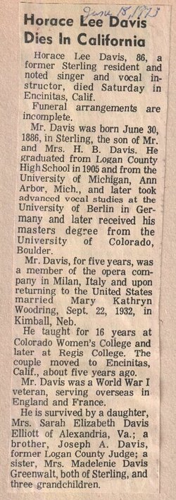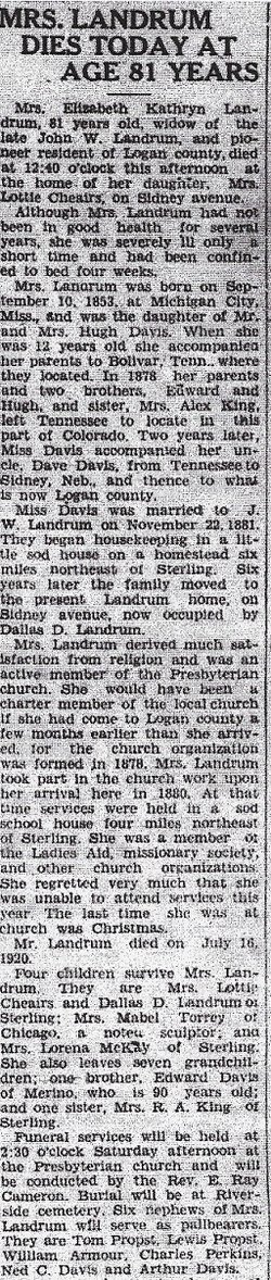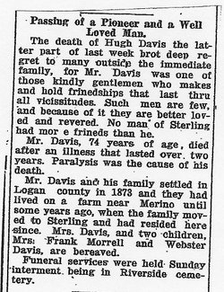 The parents of the Davis family were Hugh and Elizabeth (Jones) Davis, he a native of North Carolina, and she of Huntsville, Alabama. Mr. Davis learned the trade of a carpenter in his native state and later became a skilled mechanic. In early manhood he removed to Marshall, Mississippi, where he engaged in contracting and building. He ran the first steam saw mill in northern Mississippi. During the years of railroad building he had large contracts in bridge building, and at forty years of age had acquired a competence, being the owner of extensive plantations and many slaves. At the outbreak of the Civil War he was a wealthy man, but all his possessions were swept away by its ravages. Although he was a slaveholder he was strongly against secession and used his influence actively against it. At the close of the war he removed to Bolivar, Tennessee, where he ran a saw mill for two years. In 1878, being an old man, he was brought to Colorado by his sons, where he made his home till his death, which occurred a few months later in the old Sterling settlement. His wife lived to be 81 years of age. Her death occurred in 1895 in Sterling. In her obituary notice she was characterized as "a faithful consistent Christian woman – indeed a mother in Israel, for her children to the third generation have grown up to a beautiful Christian manhood and womanhood. These constitute the grandest monument to her memory, and are the greatest blessing she could have left to the world.” Their children were thirteen in number, nine of whom grew to manhood and womanhood. All came to Sterling, and all have had an active part in the development of the town and country. They are: Sarah A. (Mrs. Calvin) Cheairs, mother of Mrs. J. J. Cheairs; Mary E., widow of F. G. Ayres, Hugh; Cornelia, wife of the late R. C. Perkins; Edward, of Merino; Margaret, wife of D. J. Armour; Elizabeth, wife of J. W. Landrum; Amma S., wife of Alexander King; and Jacob M. Davis. Hugh was with one of the first parties who came to spy out of the land in the Platte Valley in 1873 and helped in the construction of the Sterling ditch. For a few years he made his home with his brother-in-law, R. C. Perkins. When his father and mother came he and his brother, Edward, built a home and cared for them. The little hut still stands by the road which leads past the Monroe home north of town, and is now used for a granary. This modest structure was the scene of the weddings of both Mrs. J. W. Landrum and Mrs. Amma King, who lived with their brothers until they married. Later Hugh and Edward moved to Merino. Hugh Davis married Bettie Isom, on November 17, 1881. Her father was one of the colony which settled Merino. Their children are Mrs. Frank Morrell, Mrs. L. G. Whitney, and a son Webster. Mr. Davis was a man highly esteemed and useful in the community and was actively interested in civic and religious enterprises. He contributed generously to four church buildings, projects of the Presbyterian congregation, having been a charter member of that body in Sterling. His death occurred May 12, 1923, at the age of 75 years. (Lille Gordon Whitney 1885-1944 is buried in Sterling, in a lot purchased by the Davis Brothers. So is Ava D. Whitney 1885-1984.) The descendants of this family make a creditable contribution to the population of Sterling, the largest of any family among the first settlers. In 1915 on the Fourth of July, a reunion of the family and picnic was held at the home of Mrs. J. J. Cheairs. Eighty-eight members were present, the oldest being "Uncle Davie"Davis, brother of Hugh Davis, Sr., aged eighty-six, and the youngest, Bryan Davis, grandson of Edward Davis, aged two months. An interesting feature of the program at this reunion was an original poem entitled "The Davis Family,"by (Mary) Mrs. Ned Davis, daughter-in-law of Mr. and Mrs. J. M. Davis. It is as follows: On the hillside of the prairie, In the land of corn and cotton, In the great state, Mississippi, Lived the elder, Hughie Davis, With his loving wife Elizabeth; On the river Wolf, their home. Davis" Mills were close beside them; Thirteen children blessed their happiness; One alone, ere manhood reached him, To the home of the Great Father, To the happy land eternal, At the age of thirteen left them. And the others of this family Grew to manhood and to womanhood, The Creator of the Nations Looked upon them with compassion; With a father"s love of gentleness, Blessed them with the greatest blessings. "As unto the bow the cord is, So unto the man is woman, Useless each without the other."Thus the youthful Davis family Said within themselves and pondered; Thus they chose their heart"s desire. From this home they all departed To the home of their beloved. And the elder Hughie Davis Turned again unto his labor, Sat down in his sunny doorway; Murmuring to himself and saying: "Thus it is our children leave us, Just when they have learned to help us, Leaving all things for a strange land.” For this happy Davis family, To the westward had departed, To the land of hill and valley, To the land of snow-capped mountains, To the land of peace and plenty, To the sunny Colorado. In this little city Sterling, Lived so many of this family, Numbers to exceed one hundred. Far they grew in size and number – Landrum, Armour, King and Perkins, Ayres and Morrell, Cheairs and Lutin, Whitney, Hunt, Brush, Hall and curran – In this pleasant land and peaceful. In this land of Colorado Some do fish in lake and river; Some do hunt the red deer only. Some there are who trill and warble Like a lark that soars at evening; Some there are who till the cornfield, Till the land so broad and fruitful, Strip the yellow husks of harvest, Filling all the land with plenty. Some there are who take their colors, Take their paints of different colors, Paint many shapes and figures; Figures strange and brightly colored, And each figure has its meaning. Then take clay and mold the figures, Mold the figures thus suggested. Some 