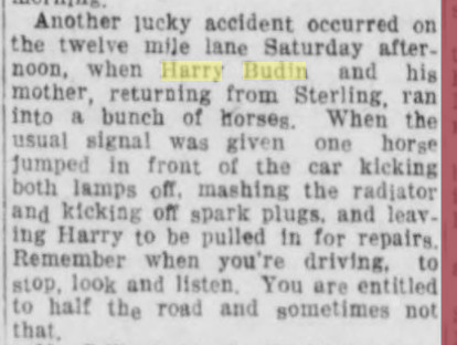 August 1917 "Harry Budin was kicked by a horse last Monday. He is getting along very nicely at present writing."