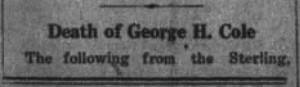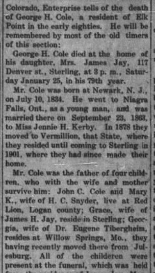 October 1907 Sterling "Geo. H. Cole of Crook is visiting his daughter, Mrs. Jas. Jay, this week."