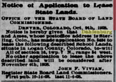 Frank Dahlenberg claimed a quarter in section 21, 7N 54W in 1890, and another in 1895.