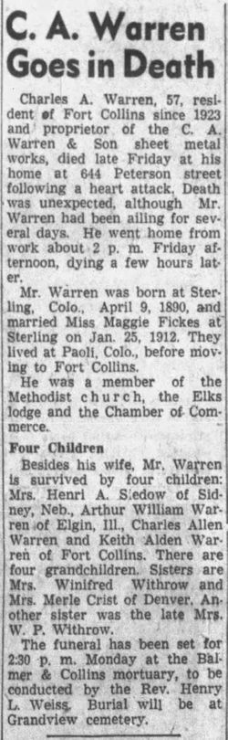 Charles Arthur Warren registered for WWII in Boulder, born April 9, 1890 in Sterling, Colorado, working for City Plumbing & Heating, living with Maggie Mae at 1621 9th .