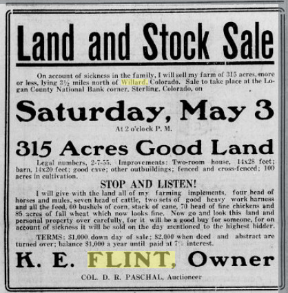 May 1919 "Miss Ella Flint of Willard left Monday night for Arvada, Wyoming, for a short visit