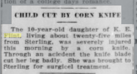 August 17 " The little daughter of K. E. Flint, who was so badly cut below the knee with a corn