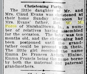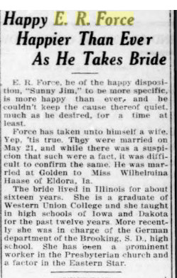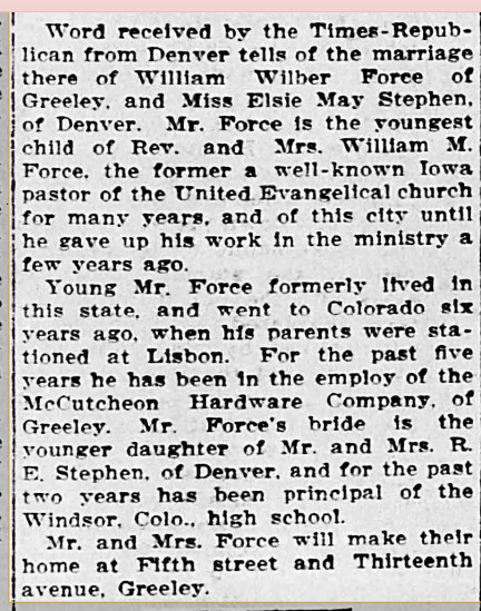 June 20, 1912 Windsor, Colorado "Miss Elsie May Stephen and Mr. Wm. Wilbur Force