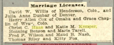 Katie M. Kemper and Christ C. Haas married on 8 Feb 1905