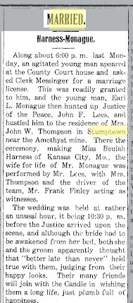 Earl L. Monague and Beaulah Harness married at Stumptown,