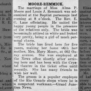Hazel M. Moore, 23, married Chas. F. Curran, 32 on July 9, 1925 in Grand Junction.