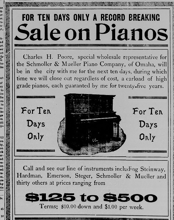 In 1907 Omaha, Charles H. Poore is a salesman for Schmoller & Mueller Piano Company, living at 1608 Maple.