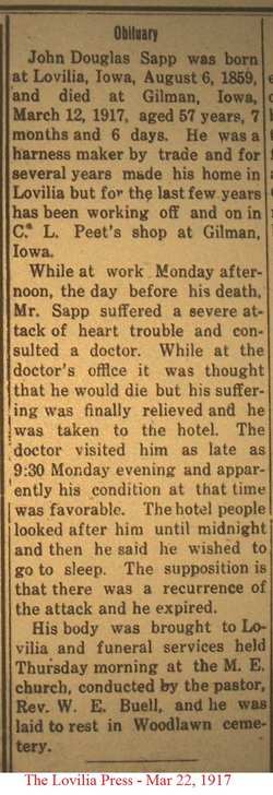 In 1910 Des Moines, J. D. Sapp, 49, married, a harnessmaker, is a lodger with Stephen and C.A. Hasty