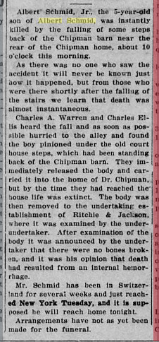August 1917 "Albert Schmid, proprietor of the Sterling Market, is suffering from a crushed ankle, caused Thursday, when a steer which he was about to slaughter, backed suddenly out of the slaughter chute and stepped on the ankle, as Mr. Schmid was in the act of closing the gate. The steer was one of unusual size, and much difficulty had been experienced in urging him into the pen. The extraordinary length of the animal made closing of the gate a hard matter and before 'Mr. ¦Schmid could secure the fastening, the steer had backed out. Although several bones were broken and other injuries had been sustained, Mr. Schmid, with the assistance of a butcher, succeeded in getting into his automobile and driving the latter to the garage, but he says the experience was a painful one."