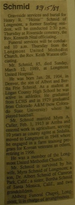 Henry Robert Schmid registered for WWII in Salida, Colorado, born January 28, 1904 in Denver, nd extension agent at the court house.