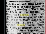 August 1907 " Master Jamie Sheely left Wednesday for his home in Lincoln,