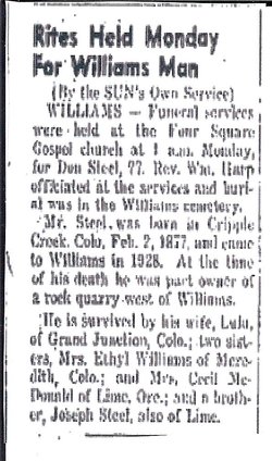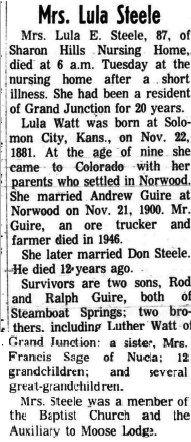 Long-time Moab resident Beverly Joyce Stewart Guire died on Friday, Feb. 14, 1997 in Moab. She was born on Sept. 1, 1922 in Grand Junction, Colorado, a daughter of Eula Gladys Rakestraw and Clive Charles Stewart. She married Walter Raymond Guire on June 24, 1944. Beverly is survived by two daughters, Sheila Dickinson of La Sal, Utah and Billie Jo Wilson of Moab. Also surviving are two step-children. May Wilson of Nucla, Colo., and Norman Guire of Provo, Utah; two brothers. Jack Stewart of Moab and David Stewart, Sr., of Grand Junction Colo.; 16 grandchildren, numerous great grandchildren and great-great grandchildren. She was preceded in death by her husband, Ray, two step-sons Andy and Walter Guire, and three brothers, Harold, Dick and Buster Stewart. Graveside side services were held at Sunset Memorial Cemetery, Moab."