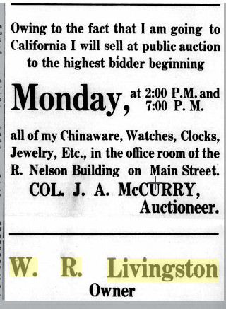 November 1908 "Mrs. W. R. Livingston, who has been in California for some months is expected home soon."