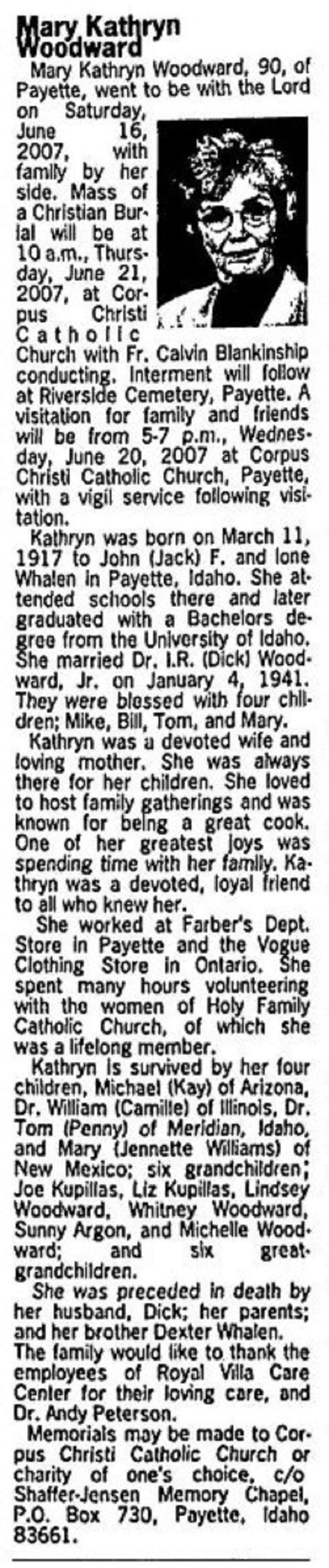 He leaves a wife two sons, Dr. J. C. Woodward of Denver, Colo. and Dr. I. R. Woodward of Payette, Idaho.
