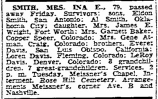8/28/1909 in Colorado to Grant Smith and Ina Davis, died in Kerrville Texas 3/11/1971 - to be buried