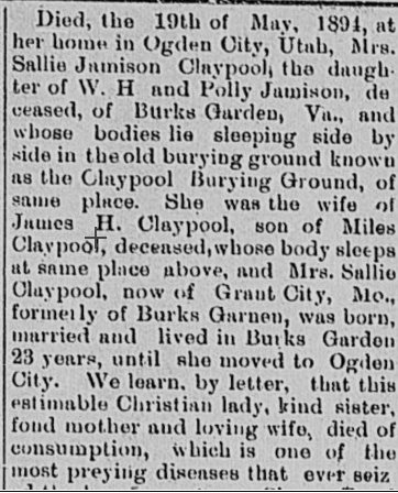 Bostonia's mother "Claypool, Sallie "Gose" (Mrs.) died December 7, 1894.