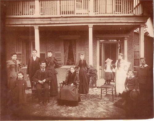 Left to right in back: Lily Halstead Foster, with daughter Jessie in front, F. Elmer Halstead, Elsie Halstead Bidwell, Olive Halstead Lippincott, Isaac Newell Halstead (on chair), Letitia Pearl Halstead (Bryant), Henry Earl Halstead, Milbert Ernest Halstead. In front: Isaac Halstead, Virginia Ann Worthen Halstead (both seated)