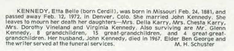 In 1910 Logan County John Kennedy and Etta have Della and Stella, both 9 born in Missouri, Chesta 7, and Glen 2.
