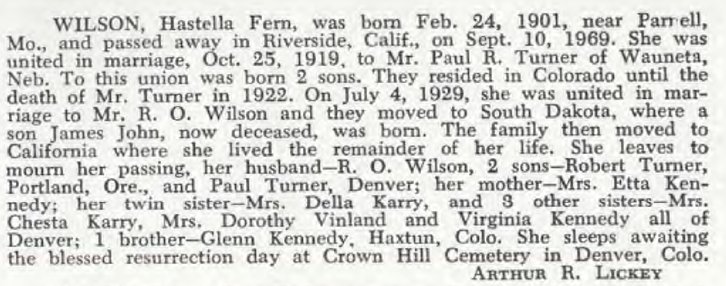 "Hestella" Fern Wilson is buried in Crown Hill , Block 68, lot 351 D, and sister Virginia Kennedy is buried next to her.