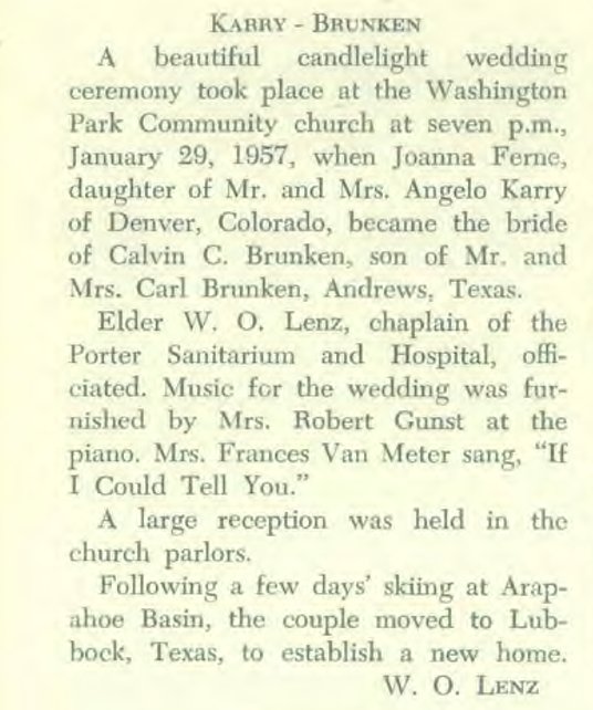 She was born July 1, 1929, in Denver, Colo. She married Calvin Brunken on Jan. 29, 1957, in Denver. She moved to Lubbock in 1957. She was a homemaker and a member of the Seventh Day Adventist Church.