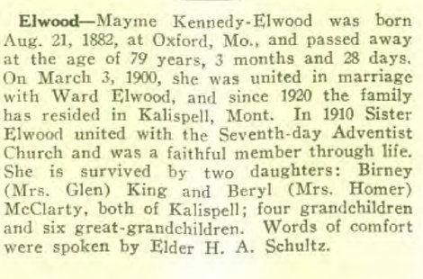 One tree said Mayme Kennedy died Dec 19, 1961 in Kalispell, Montana.
