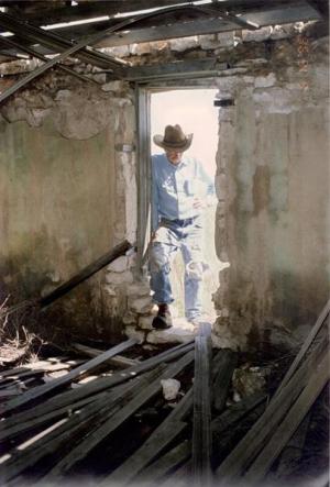Leroy Thomas, two months before his death, standing in the doorway of the homestead stone house of John McDonald.