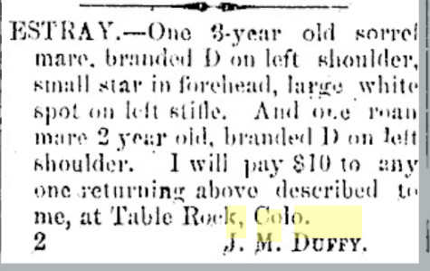 May 1878 Denver " Mr. and Mrs. J. M. Duffy, of Elbert, are at the Planter’s."