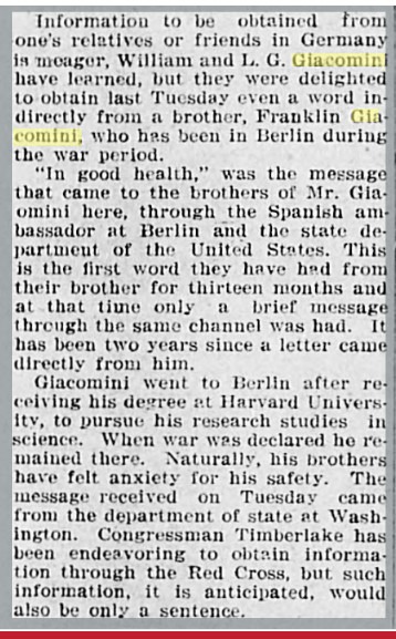 William Bernard Giacomini registered for WWI in Sterling, farming, born August 20, 1875., with Margaret as his relativ, both at 125 Hamilton.