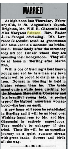 She married Lawrence Giacomini, June 29, 1925 and the couple made their home in Sterling where Mr. Giacomini established a law practice. She was the piano accompanist for Mr. Giacomini, who sang at many community events.