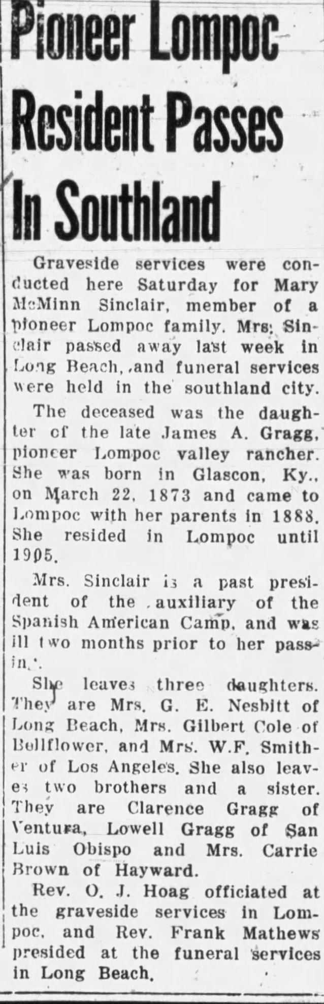 Surviving are his wife, Mrs. Goldie Gragg, Templeton, a son, James Gragg, San Luis Obispo,