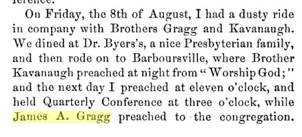 In July 1884 Denver, the Southern Methodist convention included Rev J. A. Gragg as a member of the committtee on conference relations. He was also appointed to the Following Committee on the state of the church.